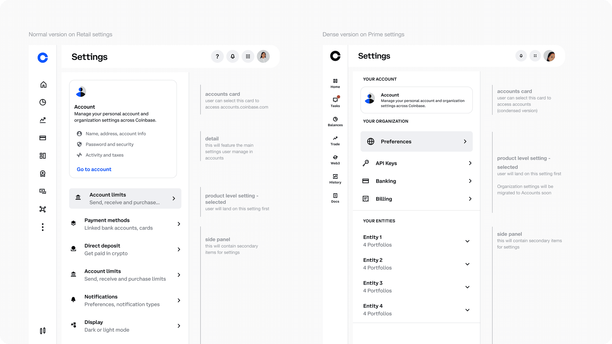 The result was a unified, platform wide system that simplified navigation, centralized account management, and created a clear distinction between account level and product specific settings. This improved usability, strengthened security, reduced support requests, and established a scalable foundation for all future Coinbase products.