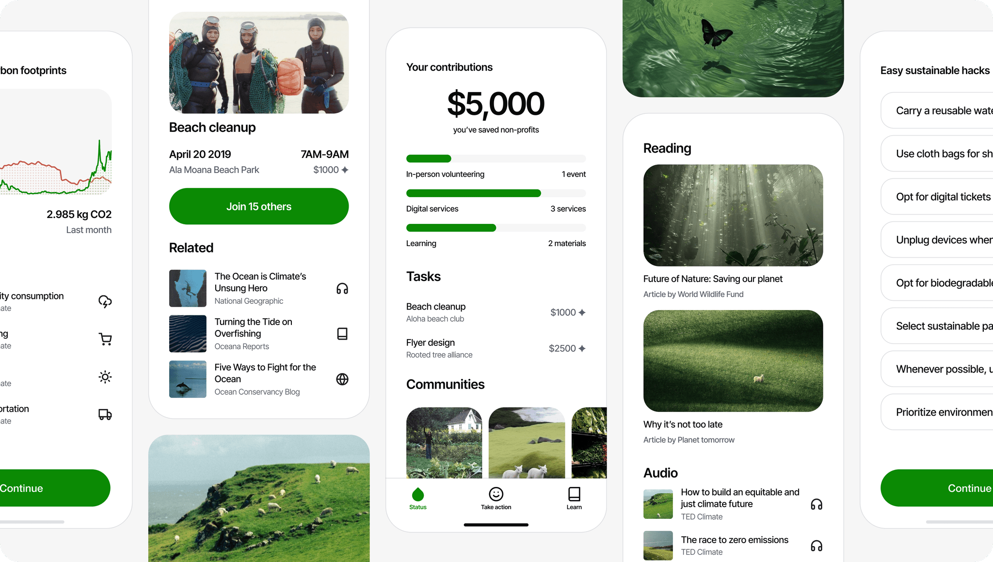 By 2020, after honing my skills at Meemo and iterating on early designs, Consrv Version 1 was born. While the first version laid the groundwork, I knew there were areas for improvement. Drawing from my experience in building design systems, I returned to the drawing board for Version 2, focusing on streamlining user experience, enhancing visual cohesion, and refining the gamified elements to make the app more engaging and rewarding.