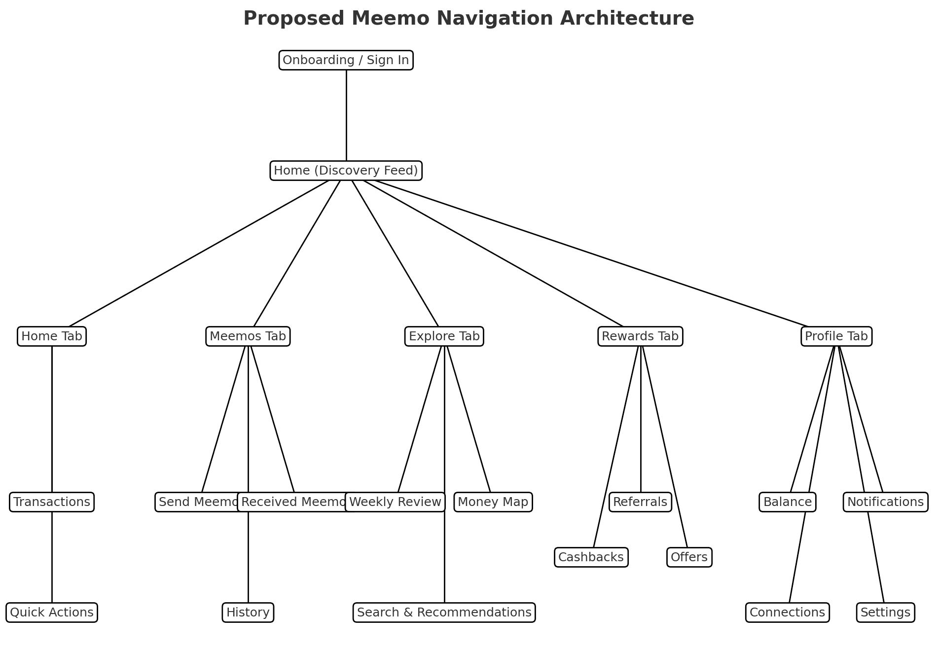 Using card sorting, click tests, and stakeholder input, we prioritized features by user value, frequency of use, and technical stability. This led to a redefined home screen and bottom navigation that elevated Transactions, Send/Receive, and Rewards as primary tabs, while secondary insights like Money Map and Weekly Reviews were surfaced contextually.